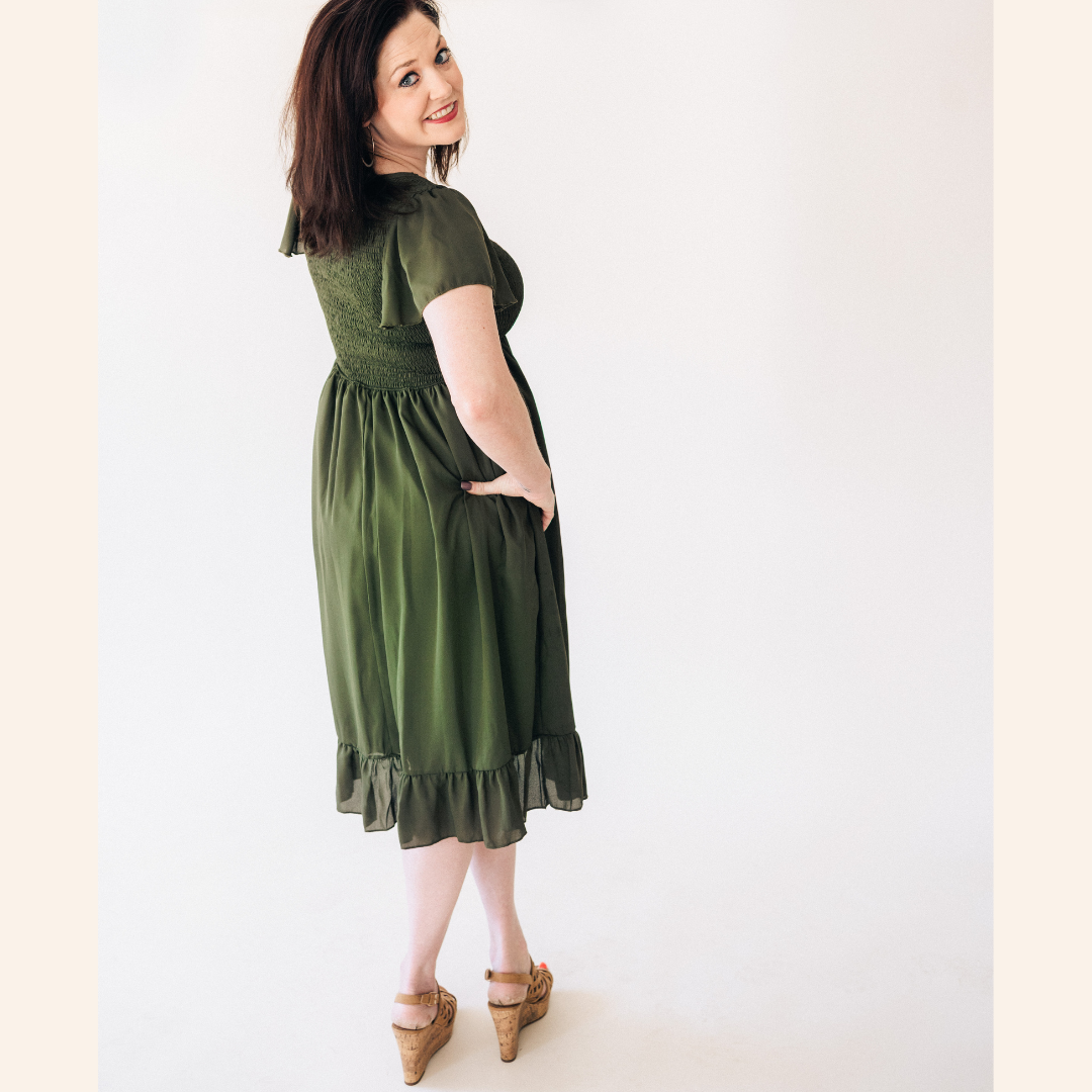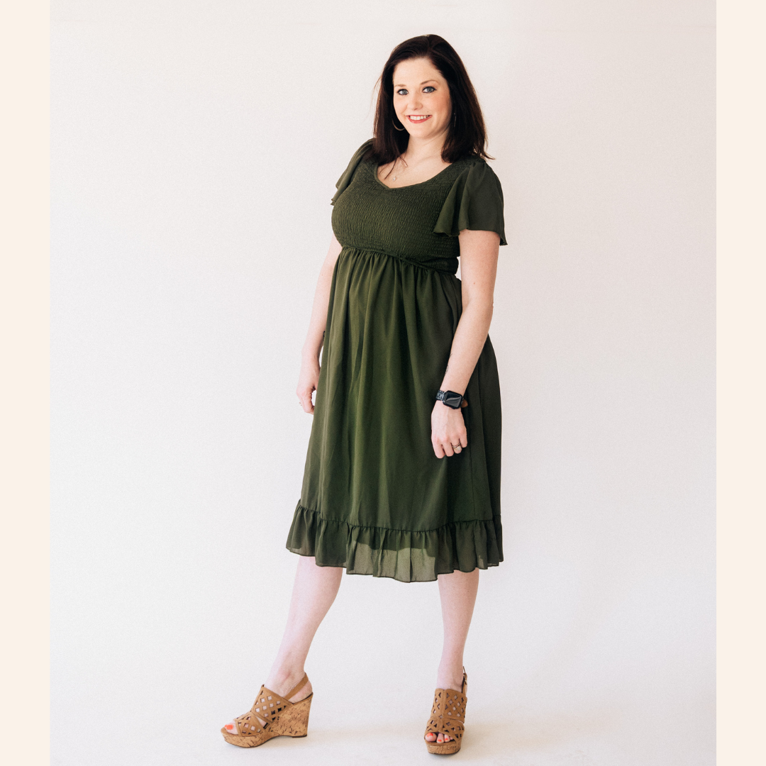 This beautiful, flowy chiffon dresses feature an elastic waist, shirred bodice, and elegant ruffles.