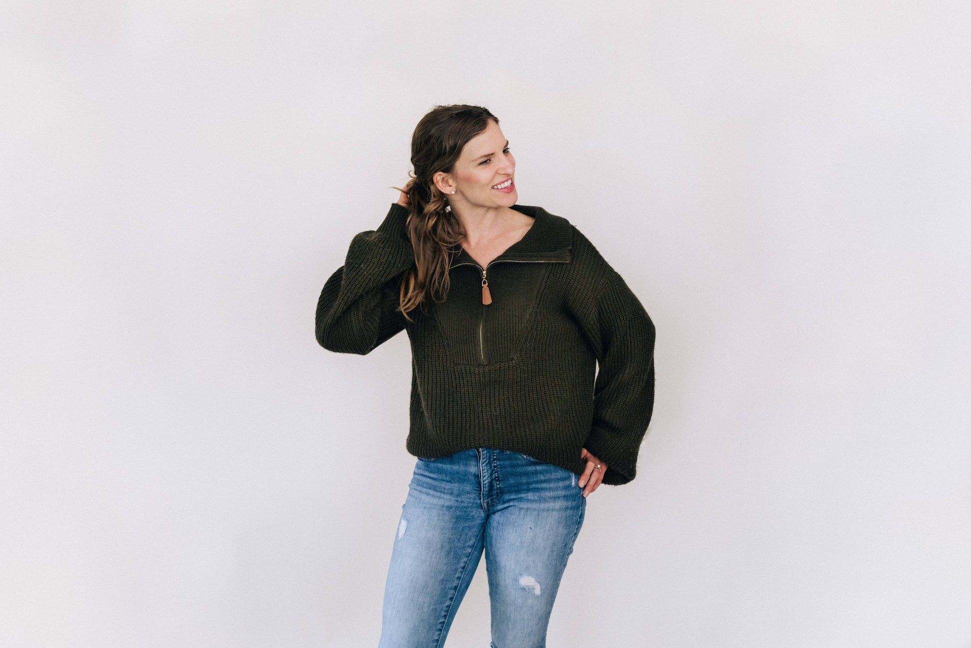 These oversized dark green knit sweaters are IT! The women's fit is a comfortable loose fitting quarter zip with lantern sleeves, a brown leather zipper pull, and wide collar.